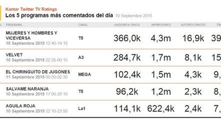 Por su parte, el regreso de 'Velvet' domina el prime time en Twitter con más de 15.000 mensajes, mientras que 'Águila Roja' cierra el top 5 superando los 7.000.