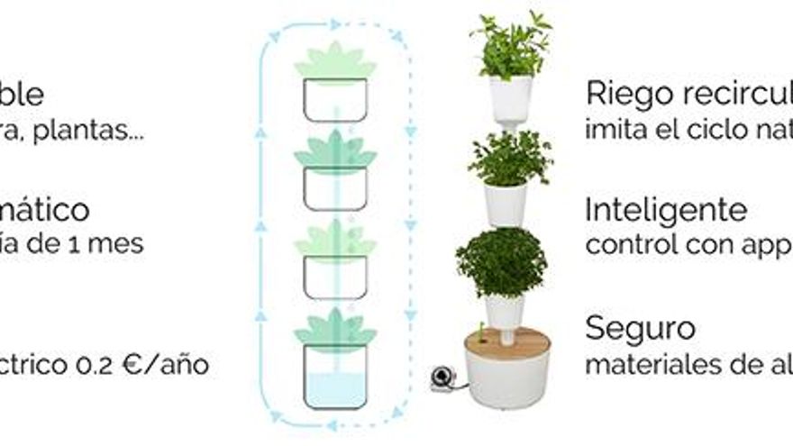 Con un diseño modular de 3 plantas y una selección de plantas purificadoras del aire, este jardín vertical de diseño se monta en pocos minutos y sin tubos por fuera. El jardín funciona mediante un sistema eficiente y sostenible para el cuidado de las plantas en ambientes urbanos, logrando ahorrar hasta un 50% de agua y nutrientes: la hidroponía. Su riego imita el ciclo del agua en la naturaleza, reutilizando el agua y los nutrientes en cada riego. El sistema de riego tiene una autonomía de 30 días y un consumo eléctrico de tan sólo 0.2 €/año.