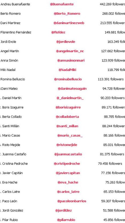 Aunque no figuren en esta lista, también destacan en Twitter, ya sea por su actividad o número de seguidores, la periodista de TVE Ana Pastor (más de 80.000) o el colaborador de El Programa de Ana Rosa, Máxim Huerta (alrededor de 40.000)