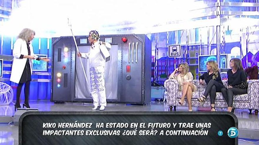 Para celebrar el lunes festivo, 'Sálvame' viajó anoche al futuro. El programa de Telecinco demostró el funcionamiento de su máquina del tiempo, y Kiko Hernández salió de ella tras su 'viaje' al futuro.