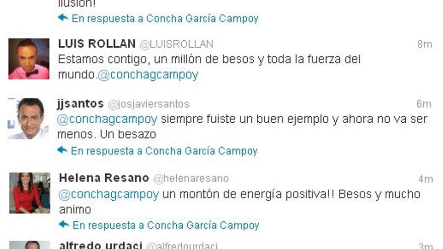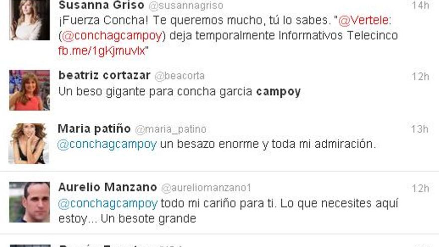 Tanto compañeros de Telecinco como de Antena 3 o laSexta han querido sumarse al aluvión de 'tuits' que la presentadora recibió tras su comunicado. Paula Vázquez le ha hecho saber “su admiración y cariño”, Helena Resano le ha mandado “un montón de energía positiva, besos y mucho ánimo” y Alfredo Urdaci le ha deseado “que todo vaya bien y vuelva pronto”.