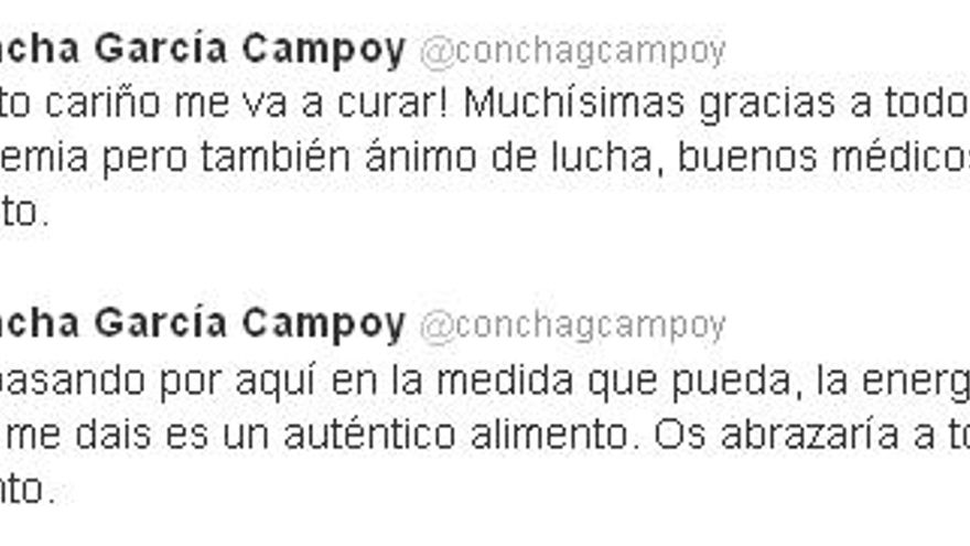 Concha García Campoy ha hablado por primera vez esta mañana, a través de su cuenta personal de Twitter (@ConchaGCampoy), tras saltar ayer la noticia de su baja por enfermedad: “Tengo leucemia, pero también ánimo de lucha, buenos médicos y muchísimo afecto”.
