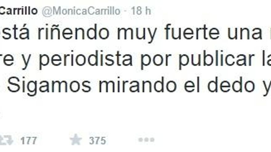 En ese primer grupo se han situado medios como El Mundo, que incluso llegó a retransmitir en directo, vía streaming, la reunión de portada del equipo en la que tomaban la decisión de su publicación. En esa misma línea, televisivos como Ana Pastor, Dani Rovira, Mónica Carrillo o Carme Chaparro manifestaron su conmoción acompañando sus palabras con la imagen. Carrillo se defendía de los comentarios negativos con el siguiente mensaje: “Me está riñendo muy fuerte una mujer, madre y periodista por publicar la foto del niño. Sigamos mirando el dedo y no la luna”.