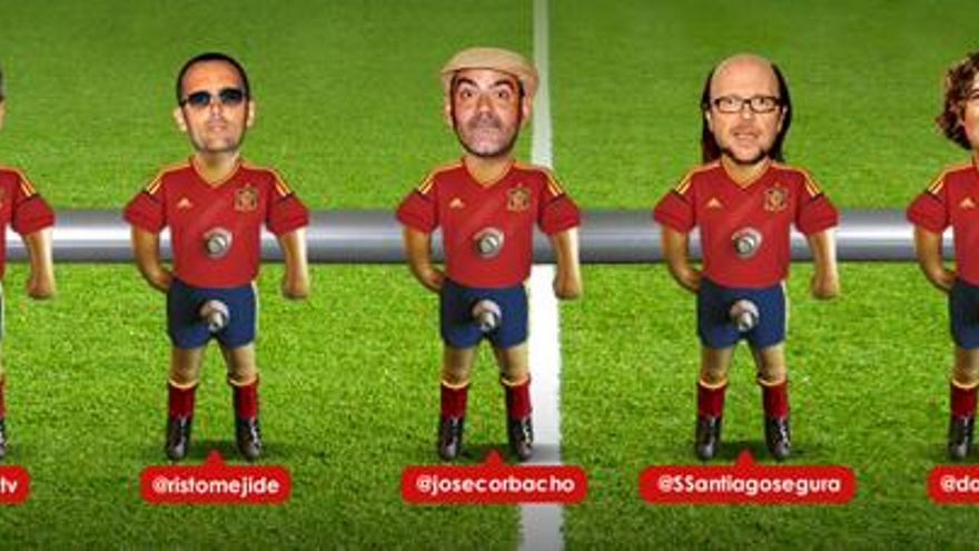 Los cinco, que cuentan con un gran número de seguidores en esta red social, animarán con su entusiasmo e ingenio a la Selección Española, creando una tertulia twittera. Todos los usuarios que sigan los encuentros de La Roja a través de Mitele.es encontrarán en la parte derecha de sus pantallas dos espacios habilitados para seguir los “twittercomentarios” del “Dream Team” como los tweets de los aficionados.