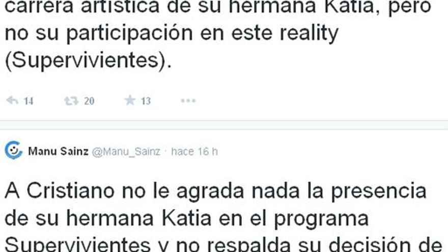 A pesar de que Elma Aveiro, defensora de Katia, aseguró el pasado lunes en el plató de Supervivientes que Cristiano Ronaldo estaba contento con la participación de su hermana en el reality, el periodista deportivo Manu Sainz aseguró anoche que no es así.