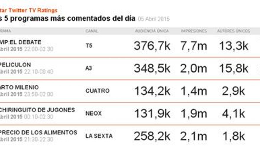 El último debate de 'GH VIP' termina triunfal en las redes sociales con más de 7 millones de impresiones y 74.000 tuits. 'Divergente', el peliculón de Antena 3 se sitúa en un segundo puesto con casi 30.000 comentarios enviados por 15.800 usuarios únicos y 2 millones de impresiones. 'El precio de los alimentos' baja del tercer puesto la semana pasada al quinto con 3.300 comentarios y 2.100 impresiones en la red.