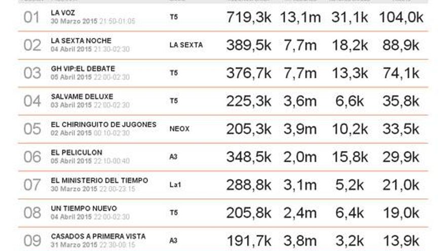 Respecto a la semana pasada, lo que más movimiento generó en las redes sociales fue 'La voz' con 104.000 tuits y más de 13 millones de impresiones. El líder de las semanas anteriores, 'GH VIP' desciende a un tercer puesto con 74.000 comentarios de parte de 18.200 autores únicos. 'Casados a primera vista' entra en el ranking de esta semana en el puesto número 9 con casi 4 millones de impresiones y 13.900 tuits.