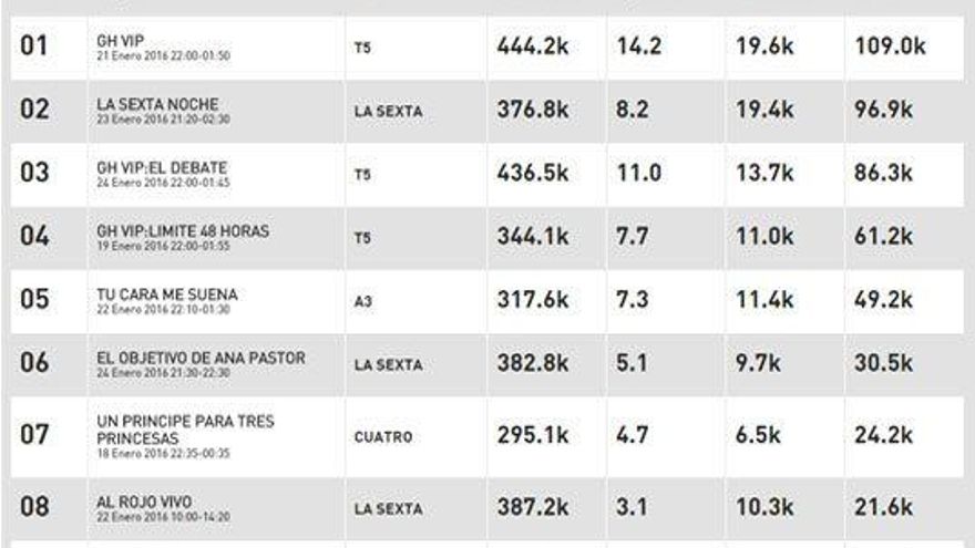 En concreto, sacó más de 50.000 tuits de ventaja al segundo programa en el ranking, 'El Objetivo', que alcanzó los 30.500 comentarios con la entrevista de Ana Pastor a Íñigo Errejón.