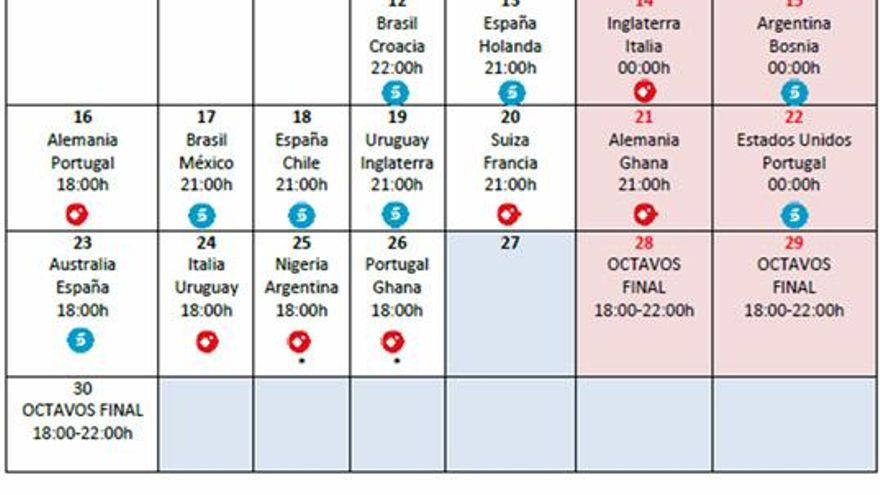 Entre los encuentros que tienen previsto ofrecer Telecinco y Cuatro en la fase inicial, aparte de los de 'La Roja', figuran el Brasil-Croacia de apertura el 12 de junio, Inglaterra-Italia, Argentina-Bosnia, Alemania-Portugal y Brasil-México.