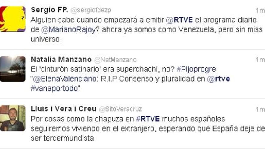 Otros también han querido realizar comparaciones, en tono irónico, con la situación imperante en otros países. Algunos se han acordado de BBC, en pleno proceso de cambios; y otros twitteros lo han hecho, no sin sarcasmo, de Venezuela y de Hugo Chávez: “¿Alguien sabe cuándo empezará a emitir RTVE el programa diario de Mariano Rajoy? Ahora ya somos como Venezuela, pero sin Miss Universo”.