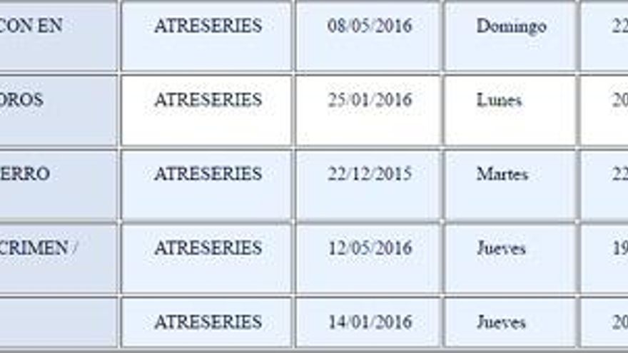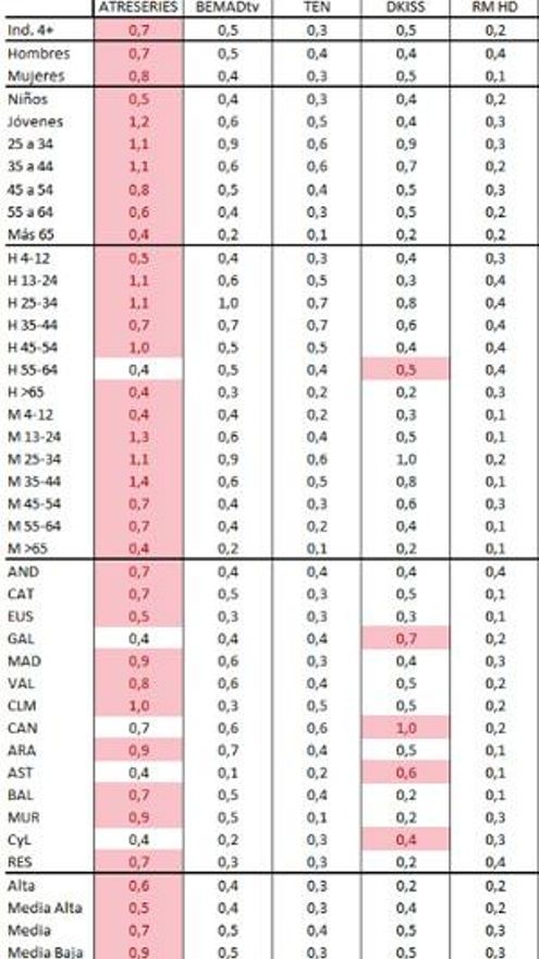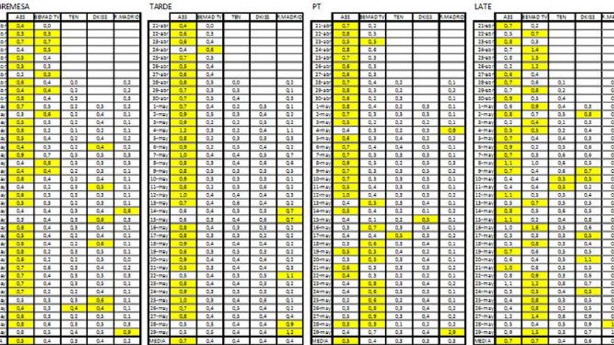 Atreseries domina el prime time casi todos los días frente a los otros canales, salvo dos ocasiones en las que Real Madrid TV ha despuntado (el pasado 4 de mayo, día en el que el Real Madrid disputó el partido de vuelta de seminifinales de vuelta contra el Manchester City y que dio un repunte a Real Madrid TV y el pasado 28 de mayo, coincidiendo con la final de Champions).
