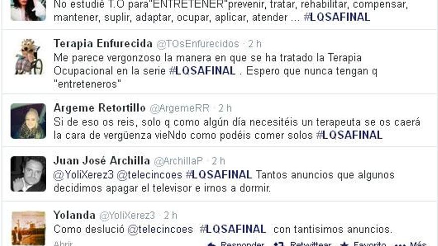 En el apartado de las críticas, éstas se centraron sobre todo en dos puntos: una en cuento a las tramas, por las bromas que durante el capítulo se hicieron sobre la terapia ocupacional; y otra en cuanto a la forma de emisión, criticando a la cadena los excesivos anuncios. A este respecto, como recogemos en sus tuits de arriba, también se expresaron Laura Caballero y Pablo Chiapella.