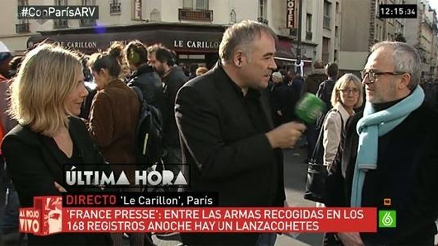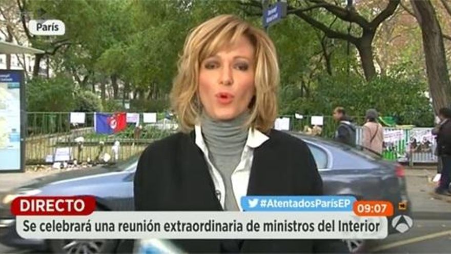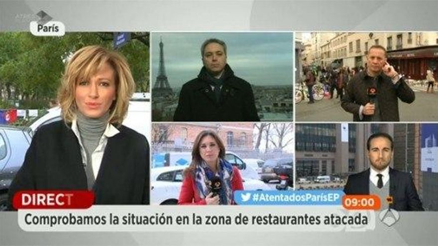 La presentadora del espacio se encuentra en solitario en la calle, al lado de la 'zona cero' en la que se convirtió la sala Bataclan. Desde ese punto ha entrevistado con una conexión en directo al Ministro del Interior Jorge Fernández Díaz, así como a periodistas, españoles testigos y diferentes personas afectadas.