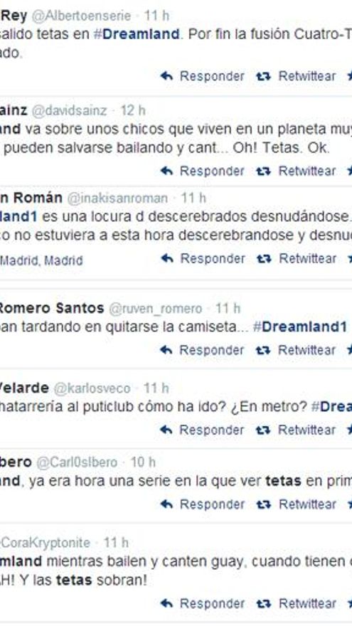 “Ya han salido tetas en Dreamland. Por fin la fusión Cuatro-Telecinco se ha consumado”, ironizaba el crítico Alberto Rey. También bromeaba en similares términos David Sainz, director de Malviviendo y Obra 67: “Dreamland va sobre unos chicos que viven en un planeta muy cercano al sol y que solo pueden salvarse bailando y cant... ¡Oh! Tetas”.Ricky García, de Megatele, llegaba a emplear la expresión “festival de pechotes”, en alusión a La que se avecina, para referirse a la serie.