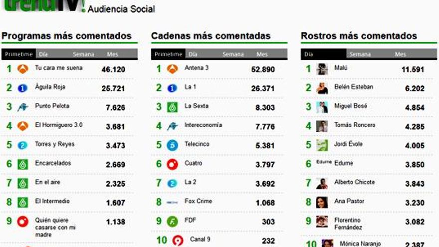 Tu cara me suena volvió a arrasar ayer en impacto social, como cada noche de jueves, con cerca de 50.000 comentarios, el doble que su principal competidora, la serie Águila roja, que sí dominó en audiencia real con el trepidante final de temporada.