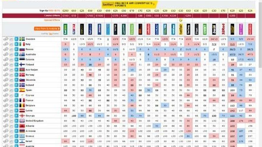 Edurne sube en las apuestas para ganar Eurovisión. La representante española ha dado un salto que la acerca ya al top-10 del Festival, aunque sigue muy lejos de los grandes favoritos Suecia, Italia y Rusia.