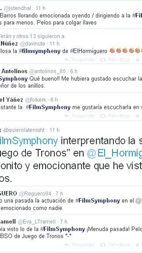Los espectadores del programa compartieron a través de las redes sociales su emoción por la actuación de la orquesta. El hastag que utilizó el espacio (#FilmSymphony), y que además sorteaba entradas para la gira de la Film Symphony Orchestra, se convirtió en el tercer Trending Topic nacional, y se mantuvo toda la noche.