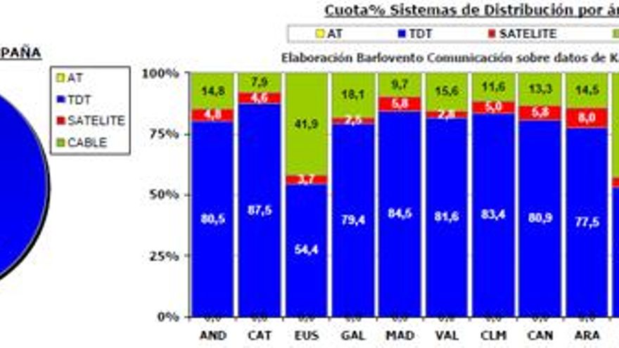 El consumo a través de TDT (80,5%) sube cuatro décimas respecto al mes anterior y alcanza récord mensual, mientras que el Satélite baja tres (4,7%). El Cable baja también dos décimas en este mes (14,7%). Cataluña es la región que más consume a través de TDT, País Vasco y Asturias las que más lo hacen utilizando el Cable y Aragón el Satélite.