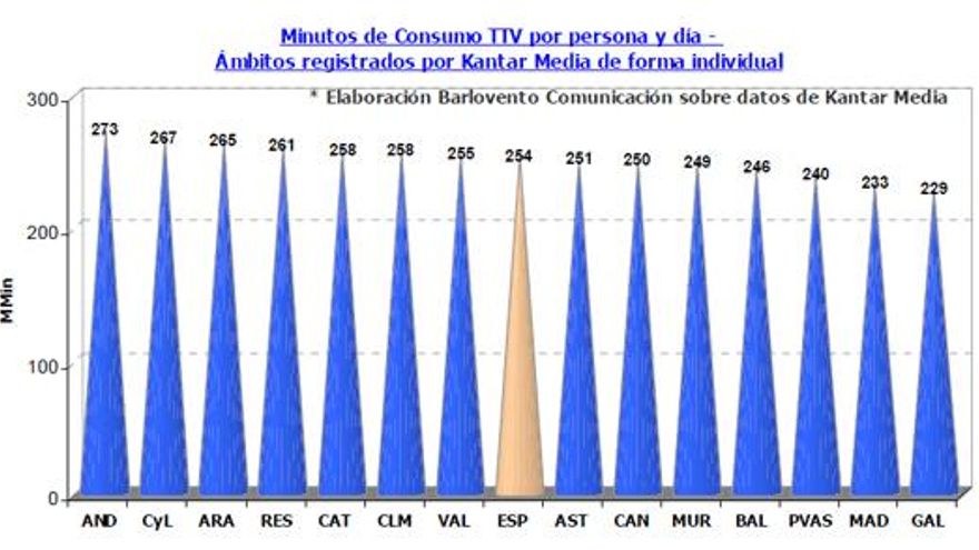 Abril promedia un consumo televisivo de 254 minutos por persona al día (4 horas y 14 minutos). La cifra supone un minuto más que el mes anterior y dieciocho más que el mismo mes del año anterior. Andalucía (272 minutos) encabeza el ranking por comunidades, mientras que Galicia es la de menor consumo (229 minutos).