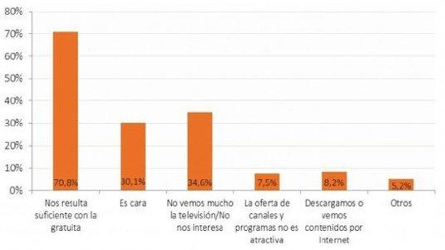 Los españoles lo tenemos claro: preferimos la televisión en abierto que la de pago, tal y como confirman los datos extraídos de la CNMC (Comisión Nacional de los Mercados y la Competencia) que recoge Panorama Audiovisual. Hasta un 70.8% de los consumidores asegura tener suficiente con la oferta de canales gratuitos que posee la TDT. Otras razones que se han argumentado para no contratar el servicio de pago son el hecho de no ver mucho la televisión (34.6%), o su precio, considerado demasiado caro (30.1%).