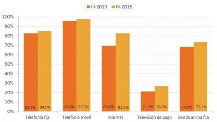 A pesar del aumento de hogares que contratan todos los servicios de comunicaciones electrónicas (telefonía fija, telefonía móvil, internet y televisión de pago), en el cuarto trimestre del 2015 el servicio de pago ha llegado solamente al 26.9% de los hogares, incrementándose en 6 puntos porcentuales desde el tercer trimestre de 2013. La opción más demandada por casi la mitad de los hogares sigue siendo el paquete de telefonía fija, móvil e internet.