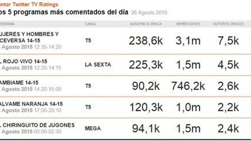 Los 5 programas más comentados en la red del miércoles 26 de agosto coinciden exactamente con los del miércoles anterior, aunque con algunas diferencias. Si bien es cierto que 'MYHYV' vuelve a encabezar el ranking; 'Al rojo vivo' le arrebata, con 11.500 tuits y la entrevista de Cristina Pardo a Esperanza Aguirre, la segunda posición a 'Sálvame'.