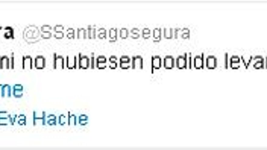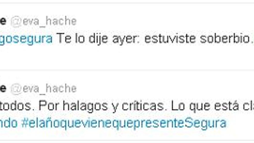 Como twittera que es, estos comentarios han llegado a oídos -o mejor dicho, al timeline- de Eva Hache que respondía con este tuit: “@SSantiagosegura Te lo dije ayer: estuviste soberbio. #losgoyapati”.
