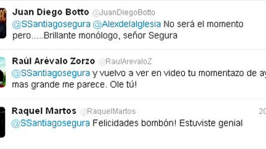 También compañeros de profesión de Segura, como Juan Diego Botto, Raúl Arévalo, Gorka Otxoa o Daniel Sánchez Arévalo, entre otros, también felicitaron por su monólogo, a través de esta red social: