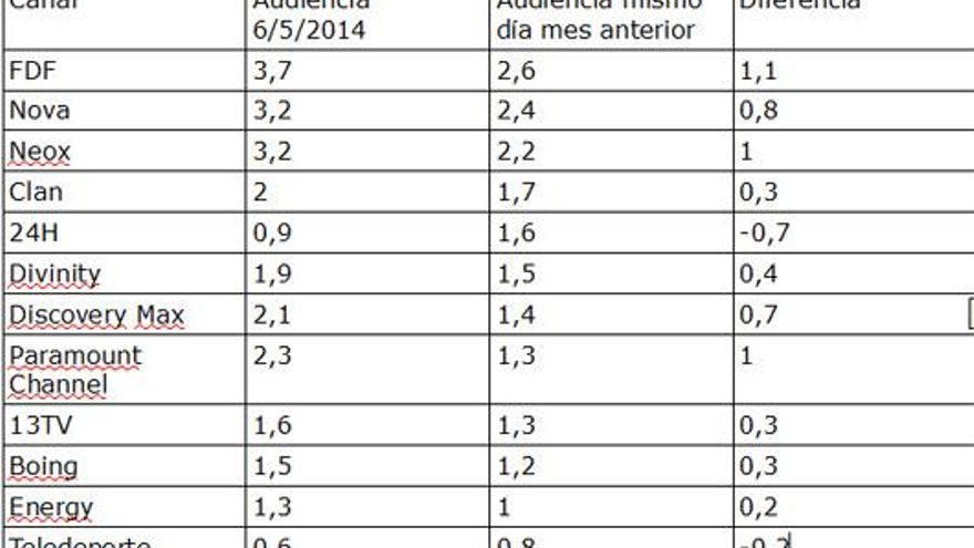 La TDT vivía ayer, 6 de mayo, su primer día con 5 canales menos. ¿Dónde han ido esos 6% de share que concentraban los ya desaparecidos Nitro, Sexta3, Xplora, Siete y Nueve? Con solo un día, es pronto para saberlo, pero hemos querido comparar la audiencia que tuvieron ayer los canales que permanecen, en relación al mismo día del mes anterior (martes 8 de abril), y estos son los resultados.