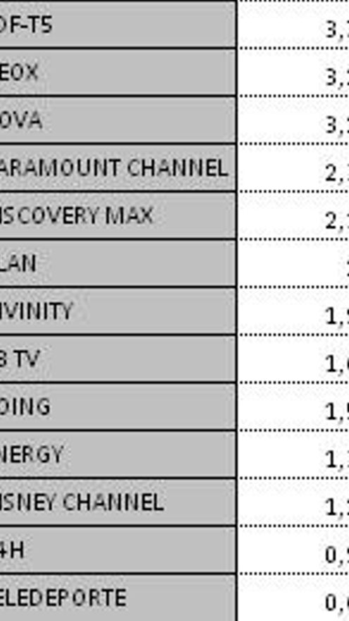 Los canales que más suben de una semana a otra son FDF, Neox y Paramount, con más de un punto cada una, seguidos de Nova (+0.8) y Discovery Max (+0.7). El resto suman algunas décimas, mientras que 24H y Teledeporte, son los únicos que decrecen.
