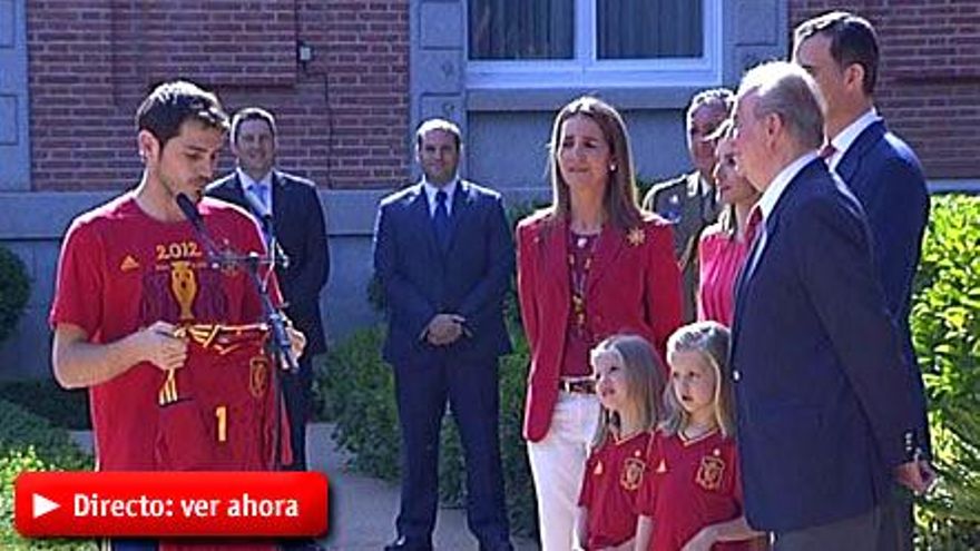 Tras estas palabras, el capitán Íker Casillas agradeció “el recibimiento” y le hizo entrega al monarca de una camiseta de la selección española con el número '1' a la espalda y firmada por todos los integrantes del equipo.
