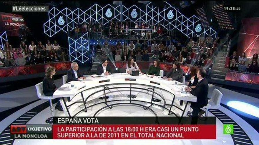 El especial ‘Al rojo vivo: Objetivo la Moncloa’ cuenta con una mesa de análisis político liderada por Ana Pastor que se ha rodeado de Rafael Simancas (PSOE), Inés Arrimadas (Ciudadanos), Echániz (PP), Rafa Mayoral (Podemos), Marina Albiol (IU), Alfred Bosch (ERC) y Maite Pagazaurtundúa (UPyD).
