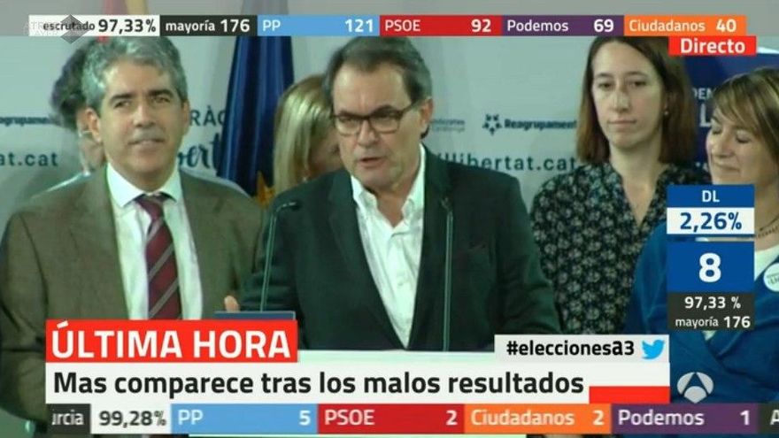 Antena 3 y laSexta conectaban con Artur Mas que explicaba que están “asumiendo responsabilidades muy grandes” y agradecía a todos aquellos que le habían votado.