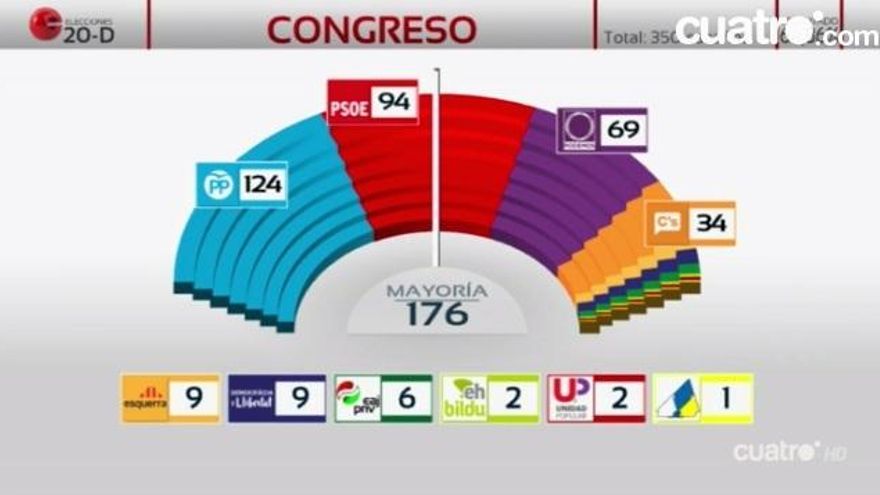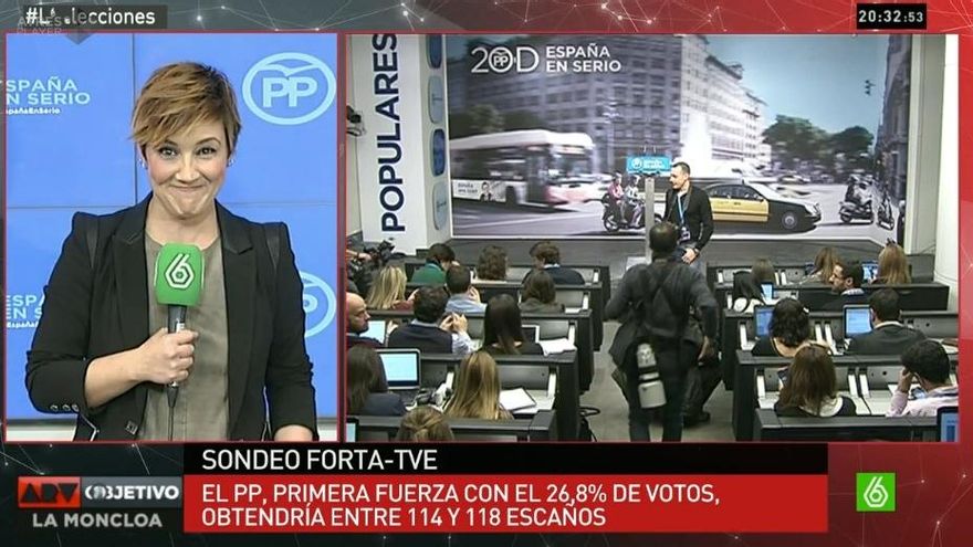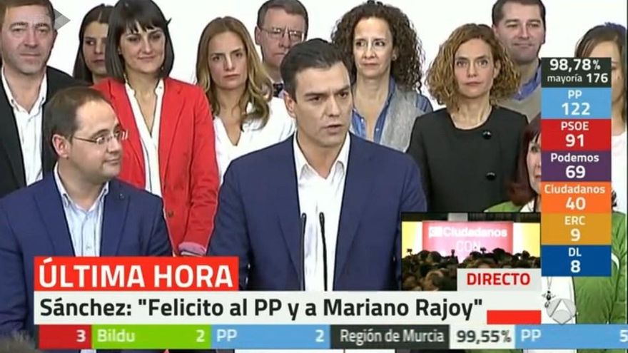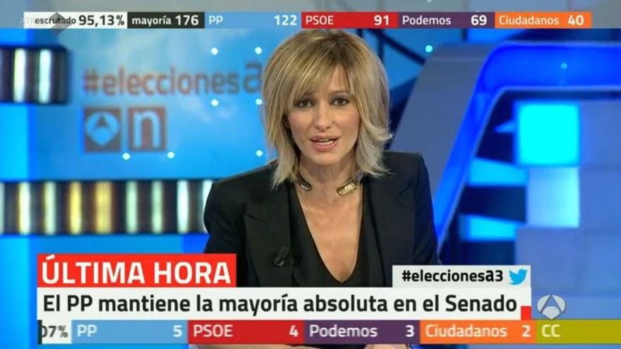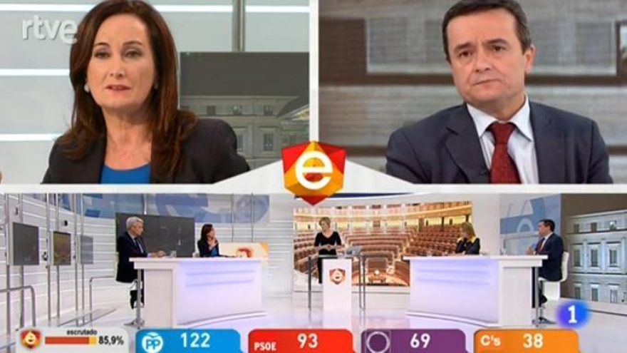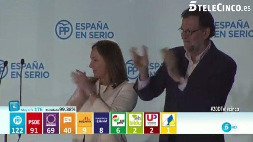 Todas las cadenas conectaban con la comparecencia de la vicepresidenta tras tener el 90'39 escrutado: “El PP ha ganado estas elecciones generales. Es la lista más votada. La segunda fuerza sería el PSOE (...) Podemos sería la tercera fuerza, Ciudadanos...” y así seguía listando cómo quedaban los partidos en el Congreso.