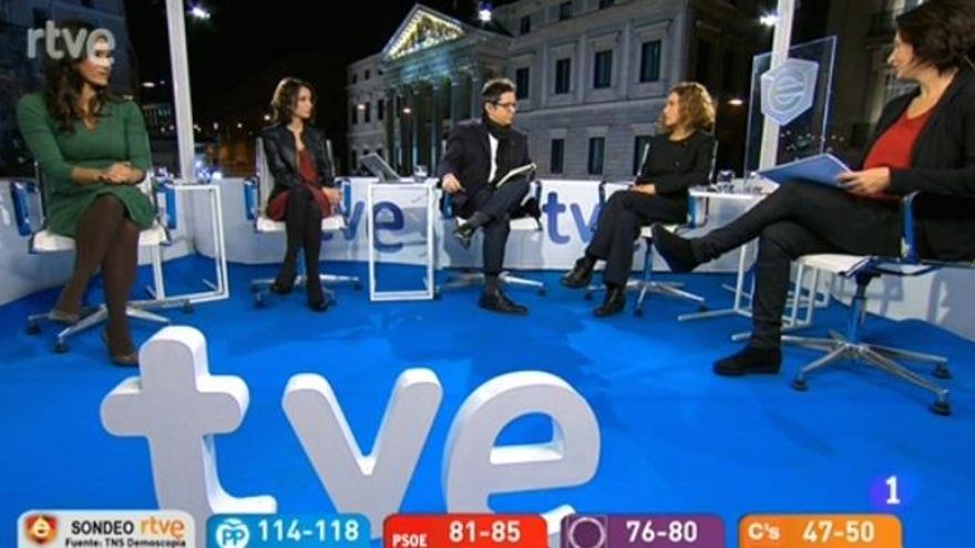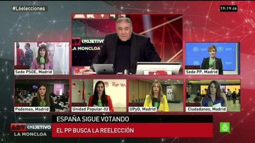 Ferreras conectaba con todas las reporteras que se repartían en cada una de las sedes de los partidos mayoritarios, entre ellas, Cristina Pardo, que se encontraba en Génova (sede del PP). En la mesa de plató, rodeando al periodista, estaban tertulianos como Ignacio Escolar, Javier Aroca, Xavier Sardà o Eduardo Inda.