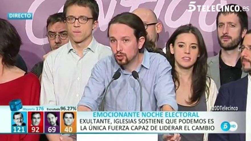 Todas las cadenas conectaban con la sede de Podemos para escuchar a Iñigo Errejón haciendo la comparecencia sobre los primeros resultados. Todas, excepto TVE y Canal 24 horas.