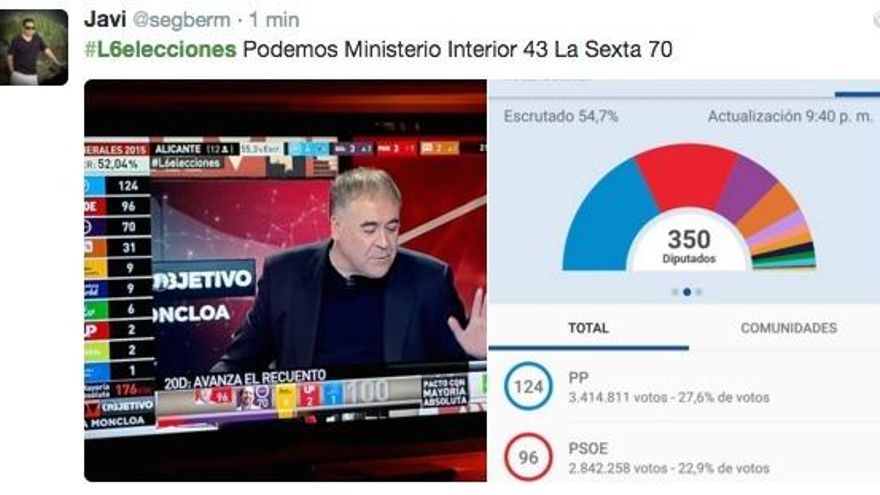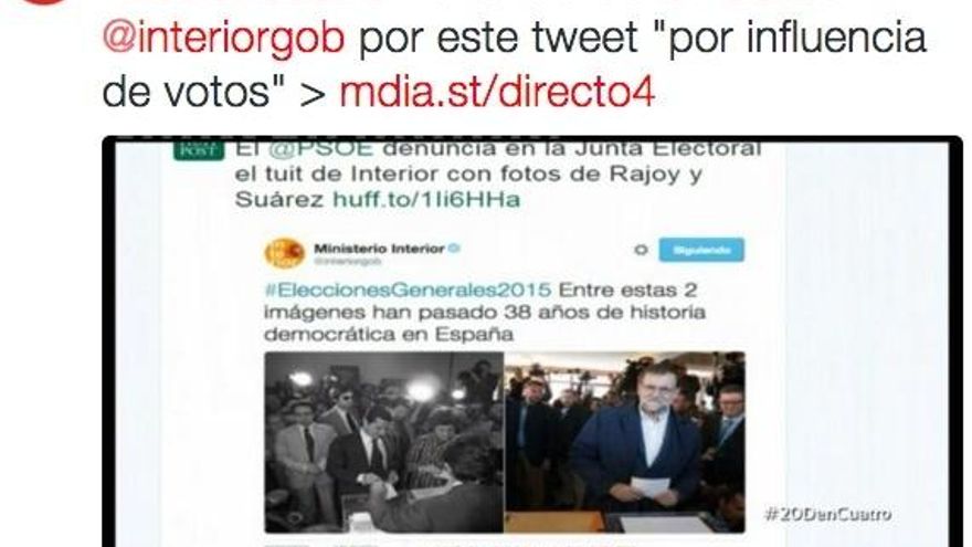 El programa se hacía eco de la denuncia del PSOE al Ministerio del Interior por el siguiente comentario tuiteado durante la mañana electoral