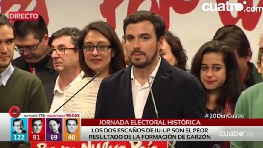 Seguidamente, las cadenas conectaban con un Alberto Garzón más serio que reconocía el panorama de su partido: “Hemos conseguido lano existencia de mayorías absolutas y no podrá continuar con la misma facilidad de recortes sociales” algo que dará más fuerza al “diálogo y la negociación”.