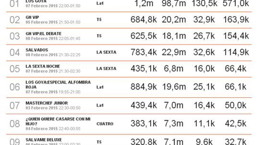 El ránking de programas más vistos, sin apenas cambios, con Los Goya todavía en primer puesto y a una distancia considerable de 'GH VIP', segunda.