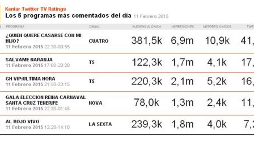'QQCCMH', que anoche tuvo un 12.8% y casi 2 millones de espectadores en Cuatro, vuelve a ser líder en Twitter con 40.000 comentarios en la red, a una distancia considerable de su segundo, 'Sálvame Naranja', que tiene 17.000 tuits. Destaca en el ránking la Gala de Elección de la Reina del Carnaval de Santa Cruz de Tenerife, que se emitió en Nova en prime time, pese al poco interés suscitado en audiencia. También, 'Al rojo vivo', que se cuela en quinto lugar gracias a su cobertura de la destitución de Tomás Gómez del PSM.