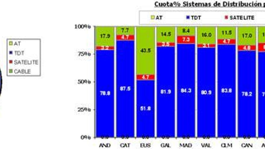 El consumo a través de TDT (79,9%) crece seis décimas, mientras que bajan el Cable (15,1%) tres décimas y el Satélite (4,8%) cuatro.