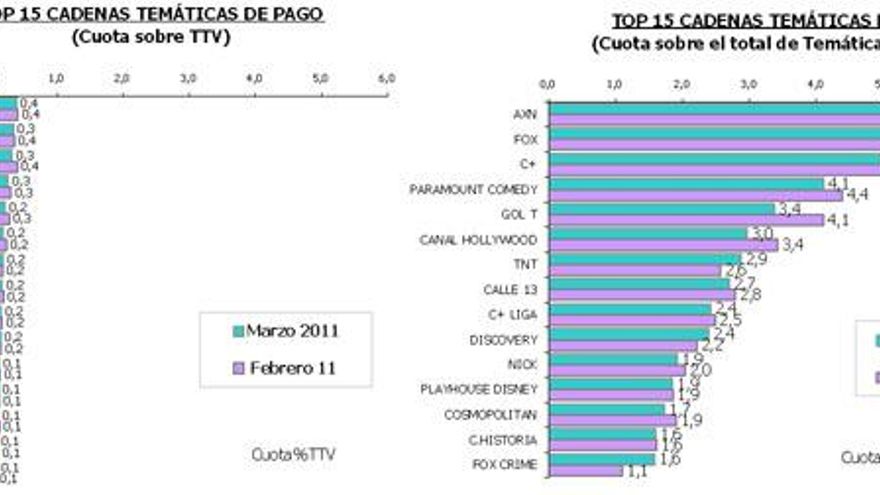 La suma de las casi 80 Cadenas Temáticas de Pago (6,4%) bajan seis décimas con respecto al mes de febrero. Logran conservar, sin embargo, el liderazgo en la franja horaria de la madrugada (02:30-07:00 horas). Las cadenas más vistas son, por este orden, AXN (0,4%), FOX (0,3%), C+ (0,3%) y PARAMOUNT COMEDY (0,3%).