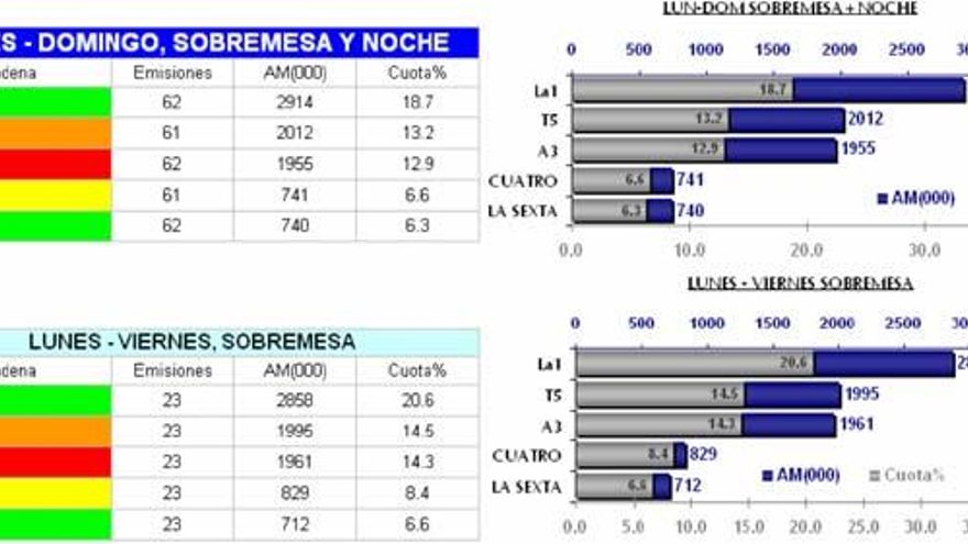 Por días de la semana, hace lo propio en las jornadas de lunes, martes, viernes y domingo, y por franjas horarias, en sobremesa y “prime-time”. La emisión más vista de la cadena corresponde al encuentro de Liga de Campeones “Barcelona-Arsenal” del día 8 con una audiencia media de 9.893.000 espectadores y 47,4% de cuota de pantalla.