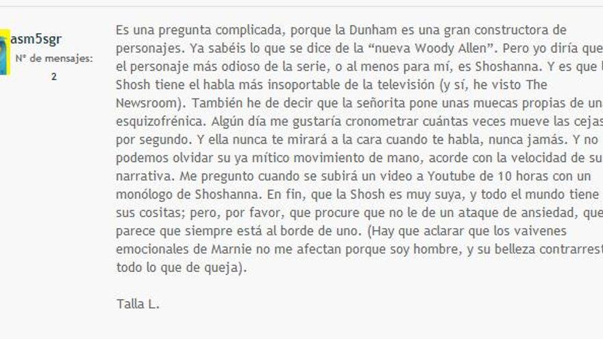¿Cuál de las cuatro chicas (Hannah, Shoshanna, Marnie y Jessa) te gusta menos y por qué?