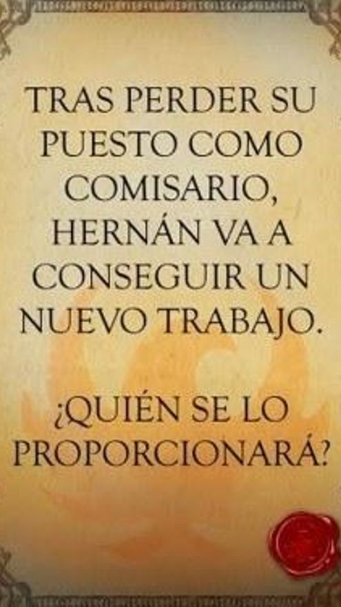 Una semana después, el 27 de mayo, lanzábamos nuestro segundo acertijo y, con él la posibilidad de ganar otro ansiado DVD. Ese día el enigma era: “Tras perder su puesto como Comisario, Hernán va a conseguir un nuevo trabajo. ¿Quién se lo proporcionará?”. Arserendipity no solo sabía la respuesta y fue la más rápida en contestar, sino que también la justificó. Por todo eso es nuestra segunda ganadora.