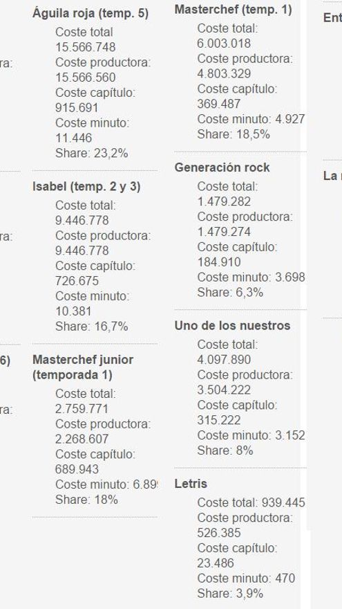 En el gráfico elaborado por la Intervención General de la Administración del Estado (IGAE), con el IVA contabilizado, se puede observar que 'Cuéntame' costó al minuto 11.792 euros en 2013; 'Águila roja', 11.133 euros; 'Isabel', 10.381 euros; 'Masterchef Junior', 6.899 euros; 'Masterchef', 4.927 euros; y 'Generación rock', 3.698 euros. Este último programa, presentador por Melendi, no consiguió continuar en la cadena, como tampoco otros más baratos como 'Uno de los nuestros' (3.152 euros al minuto), 'Letris' (470 euros) y 'Entre todos' (397 euros).