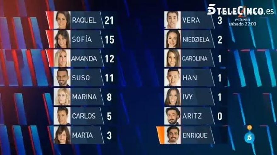 Los nominados definitivos son Raquel, Sofía y Amanda, salvándose Suso por un punto.