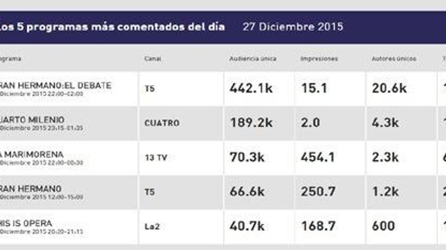 Entre el debate y la reposición se colaron dos programas poco habituales en el top 5. 'Cuarto Milenio' triunfó en la red con su especial de 'Star Wars', el cual le otorgó la segunda plaza con más de 11.000 tuits. Por detrás quedó 'La Marimorena', de 13tv, tercero con 6.300 tuits.