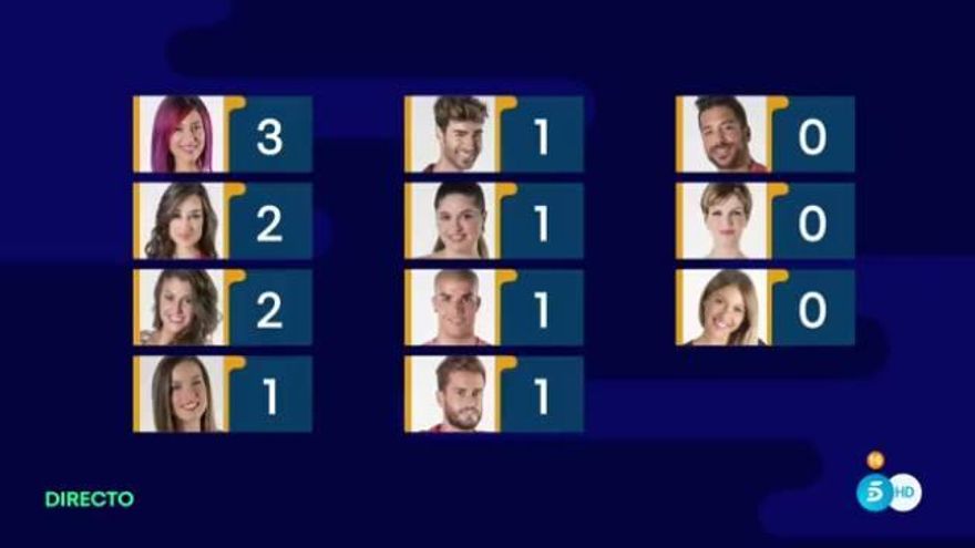 Esta semana las nominaciones eran en positivo, los concursantes daban un solo punto a la persona con la que quería llegar a la final. De esta forma, los resultados de las votaciones dejaron a Bárbara, Alain y Rebeca como los nuevos nominados.