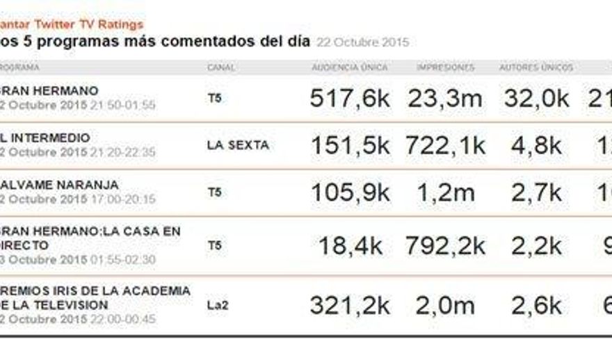 'GH' continúa dominando la red con claridad. La séptima gala del reality de Telecinco generó más de 212.000 comentarios, repitiendo liderato sin encontrar un rival que le pueda plantar cara en la red. Muy lejos, en segunda posición, encontramos a 'El Intermedio', que acumuló 12.000 tuits con las entrevistas a familiares de víctimas del franquismo.